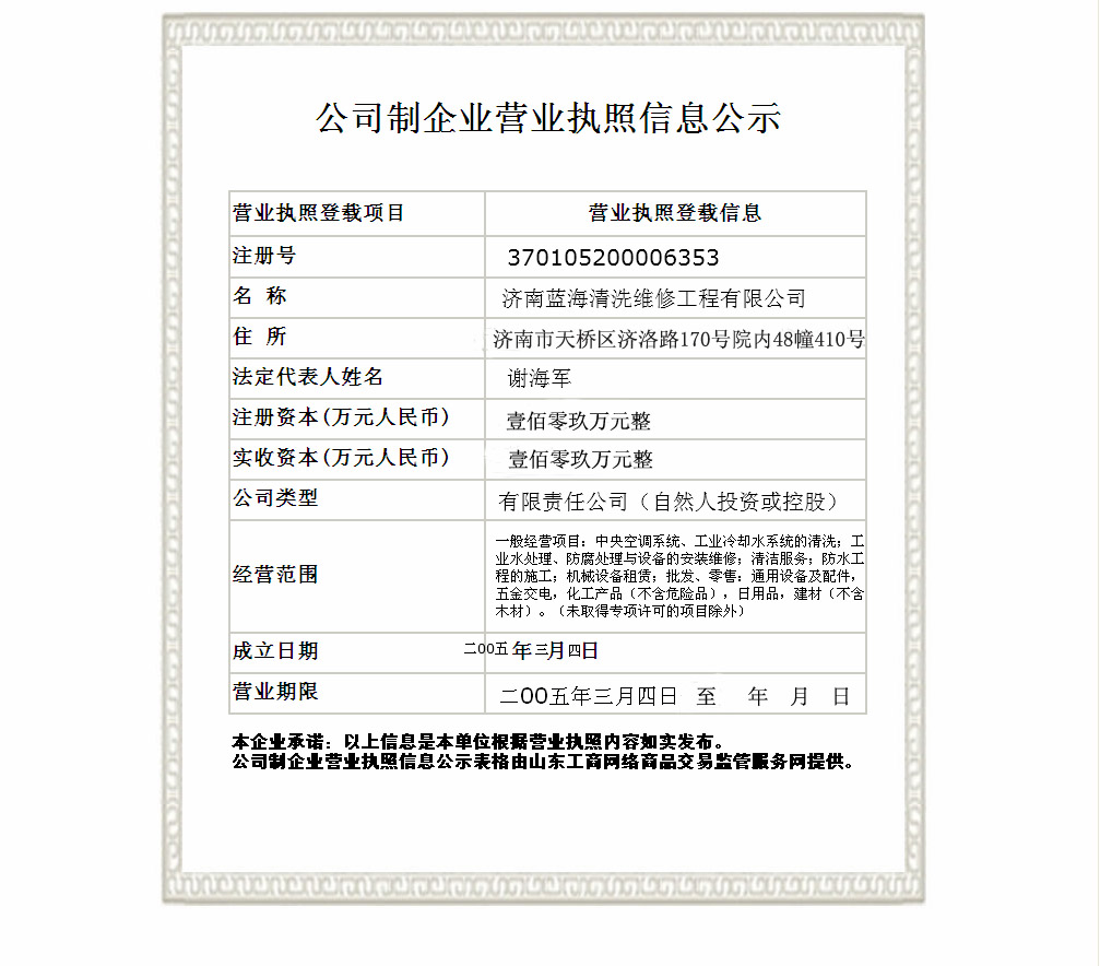 濟(jì)南藍(lán)海清洗維修工程有限公司是一家從事化學(xué)清洗、 物理清洗、水處理、機(jī)電制冷設(shè)備安裝維修、絕熱防腐蝕和防水、物業(yè)保潔等工程施工,以及相關(guān)產(chǎn)品的研制開(kāi)發(fā)和技術(shù)咨詢(xún)服務(wù),是集科研、設(shè)計(jì)、經(jīng)營(yíng)、服務(wù)于一體的高新技術(shù)企業(yè)。與國(guó)內(nèi)多家相關(guān)專(zhuān)業(yè)高等院校、研究院所密切合作,共同致力于環(huán)保綠色無(wú)腐蝕清洗技術(shù)的開(kāi)發(fā)和應(yīng)用,是工業(yè)設(shè)備、物業(yè)清洗維修領(lǐng)域中的專(zhuān)業(yè)化公司。